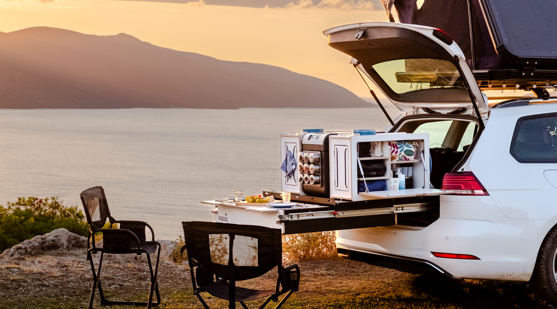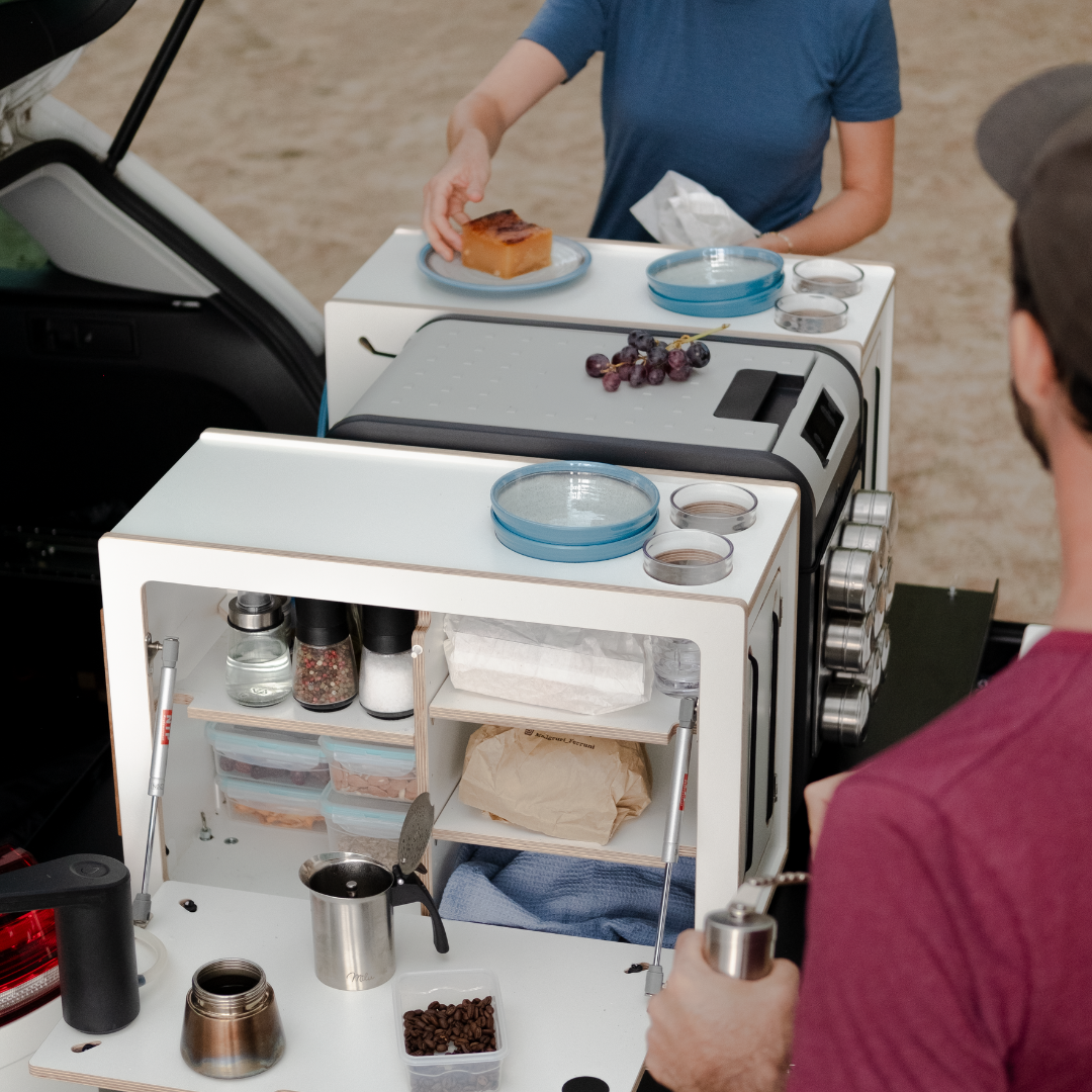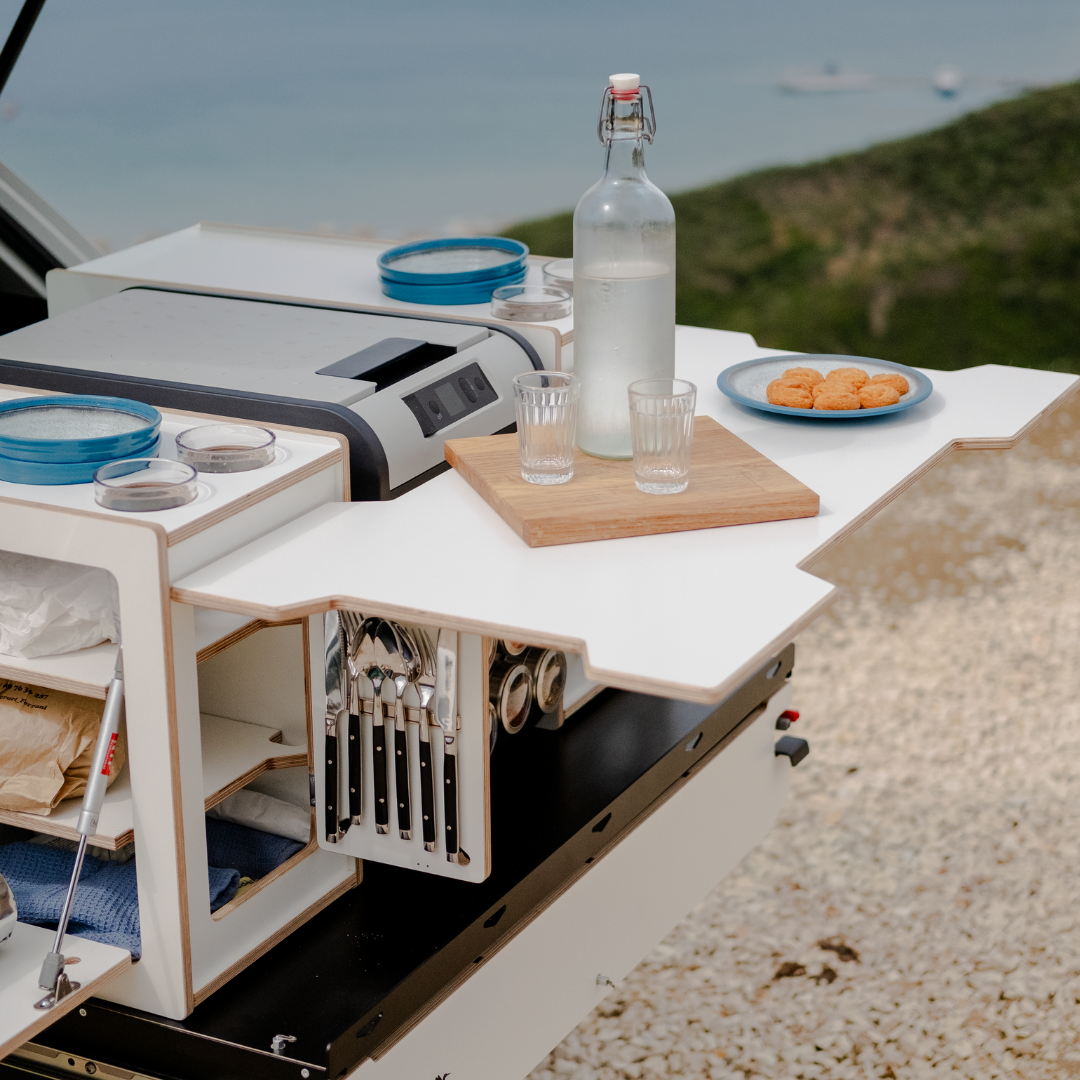 Die minimalistische Form fügt sich dezent in jeden Kofferraum und passt sich dem Stil moderner Fahrzeuge an. Push-to-Open Türen und slide&click Verbindungen der Campingboxen sorgen für eine einfache und intuitive Bedienung die Raum für individuelle Nutzung lässt.