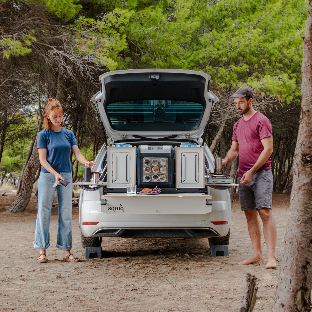Der squiq-Traveler compact kombiniert eine kürzere Auszugsbasis mit kompakten Campingboxen und ist für alle kompakten Kombis und SUVs, wie z.B. VW ID.4, Skoda Enyak, Audi Q7, usw.