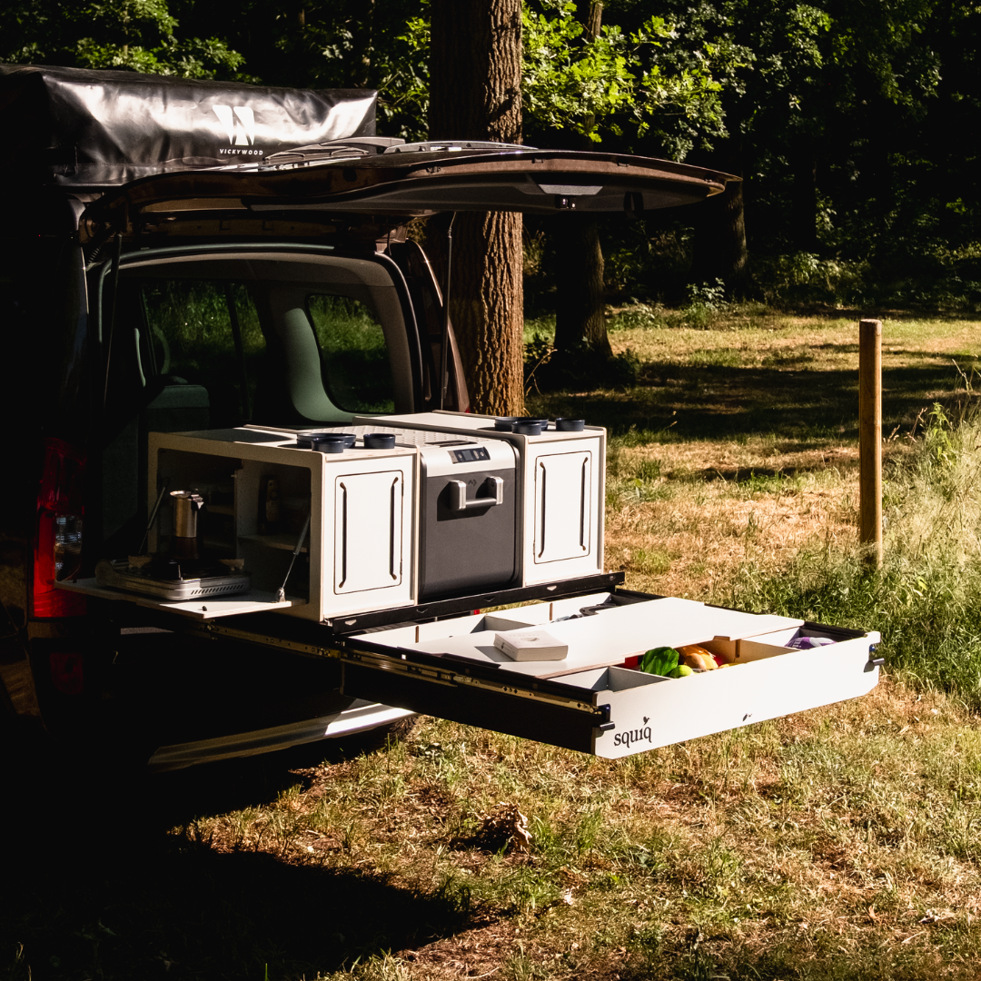 Der modulare Kofferraumauszug verwandelt als Campingbox deinen Van in einen Camper.